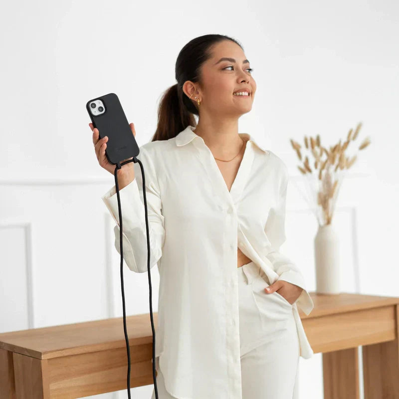 The practical 2 in 1 iPhone 15 Pro Max necklace case with replaceable cord! The smart click system allows you to change or remove the cord in seconds! The innovative material made from plant materials and the OEKO-TEX® cord not only protect your iPhone but also the environment!